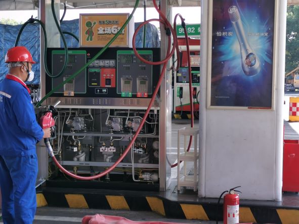 加油區(qū)設(shè)置加油罩棚,罩棚下設(shè)置3臺(tái)雙油品四槍潛泵式加油機(jī)和3臺(tái)三油品六槍潛泵式加油機(jī);埋地罐區(qū)設(shè)有6SF雙層埋地油罐,其中30m3汽油罐4只(92#2只、95#1只、98#1只)、30m3柴油罐2只(0#,折算后油罐總?cè)莘e150m3(柴油罐折半計(jì)入),依據(jù)《汽車加油加氣加氫站技術(shù)標(biāo)準(zhǔn)》GB50156-20213.0.9條辨識(shí),該站屬于二級(jí)加油站。加油站已安裝汽油卸油和加油油氣回收系統(tǒng)。